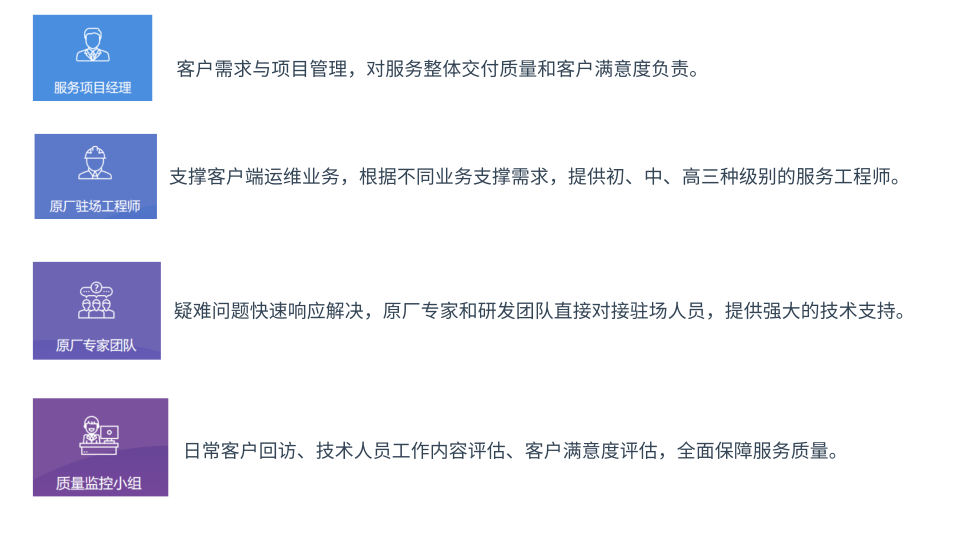 驻场工程师在客户现场工作,遵守客户单位的工作作息时间。执行客户现场需要的运维服务内容,如安装配置,巡检,值守,以及其他需要配合的工作服务内容。客户可根据自身需求选择相应级别的驻场工程师。